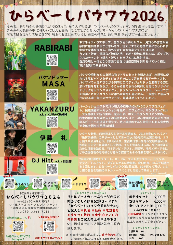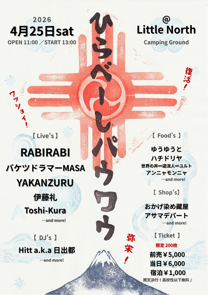 その昔、祭り好きの仲間たちから始まった 知る人ぞ知る♪「ひらべーしパウワウ」が、10年ぶりに復活します!春の芽吹く新緑の中 美味しいごはんとお酒 ここでしか出会えないマーケットや キャンプを満喫♪焚火を囲み温もりを感じながら 極上の音楽に体をゆらし 最高の時間と 熱い夜を みんなで一緒に楽しもう!